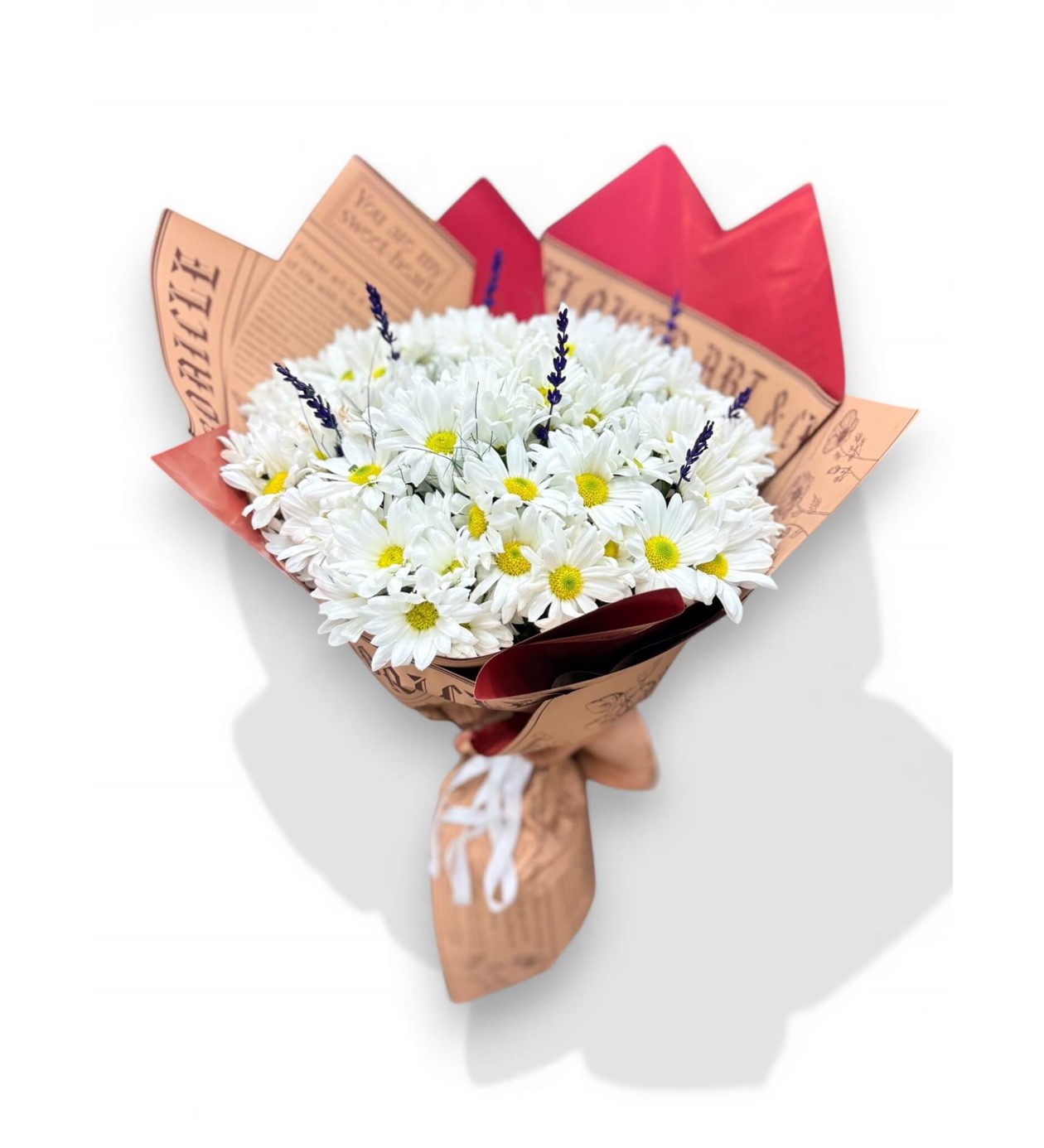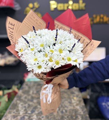 Aromatik Dokunuşlar: Papatyaların arasına yerleştirilen kuru lavanta dalları, bukete hem görsel bir derinlik hem de rahatlatıcı bir koku katıyor.