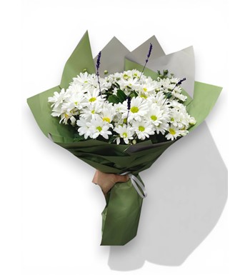 Mis Kokulu Lavanta Dokunuşu: Papatyaların arasına yerleştirilen kuru lavanta dalları, bukete hem görsel bir derinlik hem de rahatlatıcı bir koku yayar.