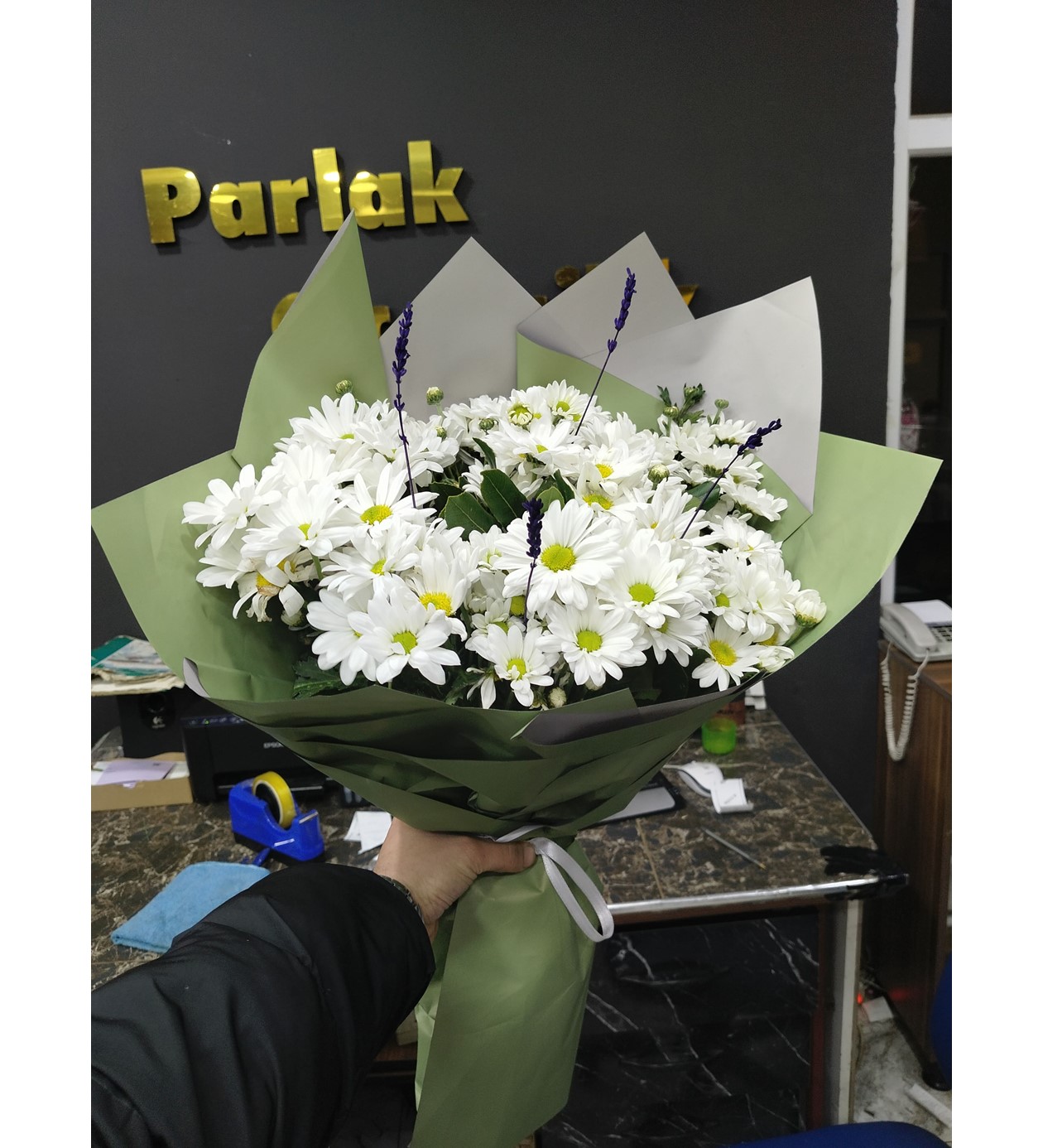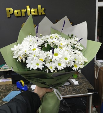 Dolgun ve Taze Görünüm: Buketlerimiz, bol miktarda iri kafa beyaz papatya (krizantem) kullanılarak zengin ve hacimli bir yapıda hazırlanır.