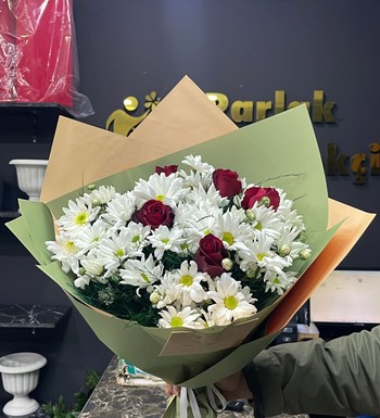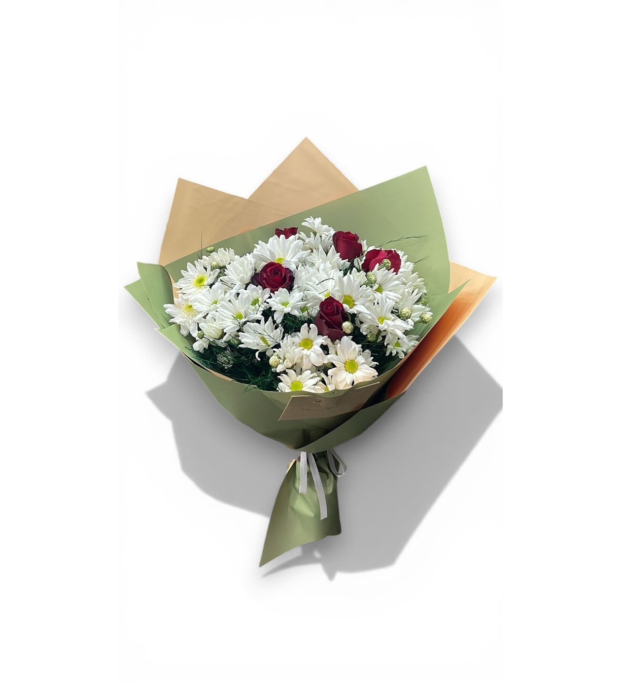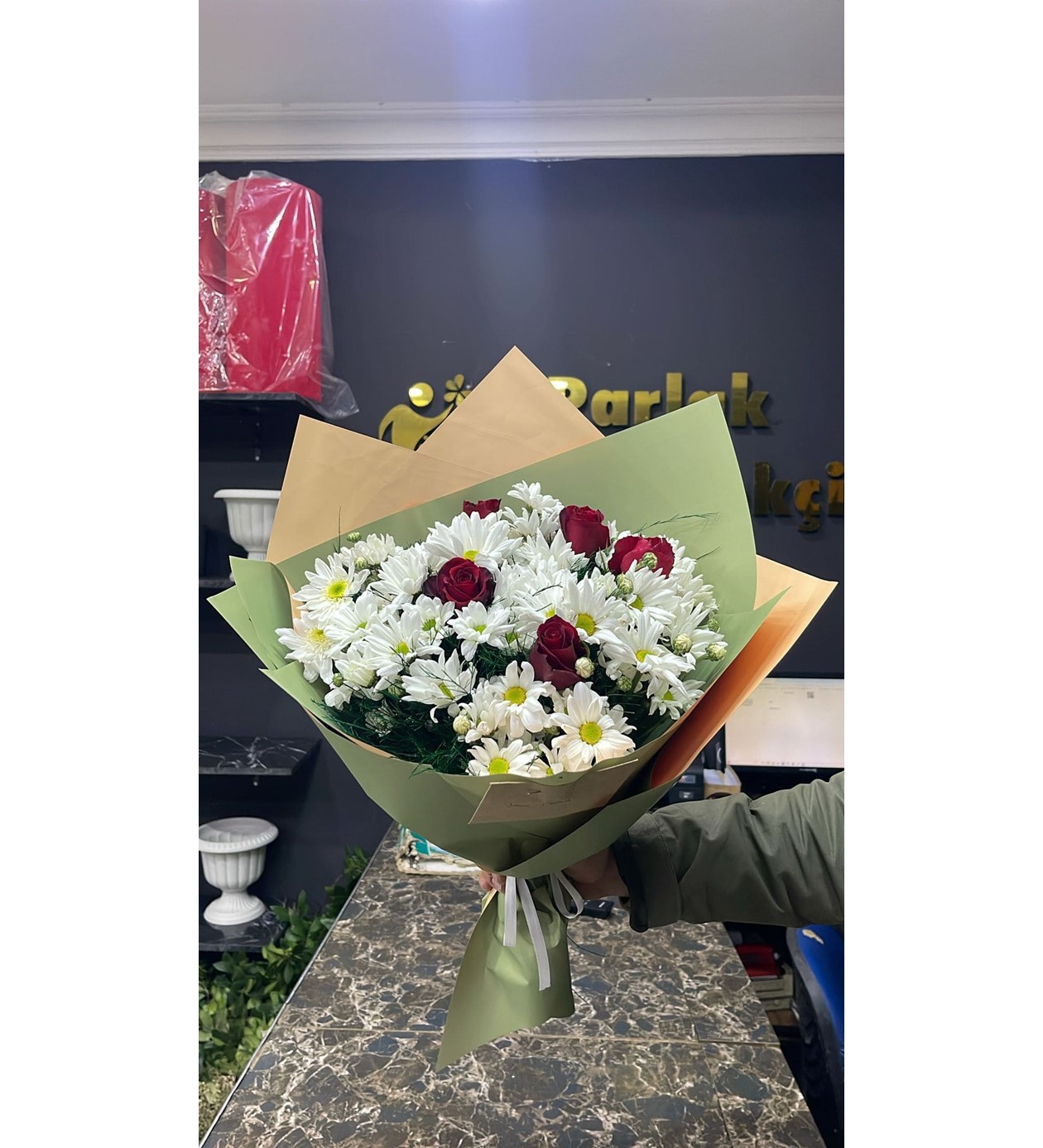 Duygularınızı en saf haliyle ifade etmeniz için özenle hazırlanan bu özel bukette, bembeyaz taze papatyaların (krizantem) yarattığı doğal şıklığı, tutkunun simgesi 5 adet seçkin kırmızı gül ile taçlandırdık. Hem modern hem de klasik bir hediye arayanlar için ideal bir tercihtir.
