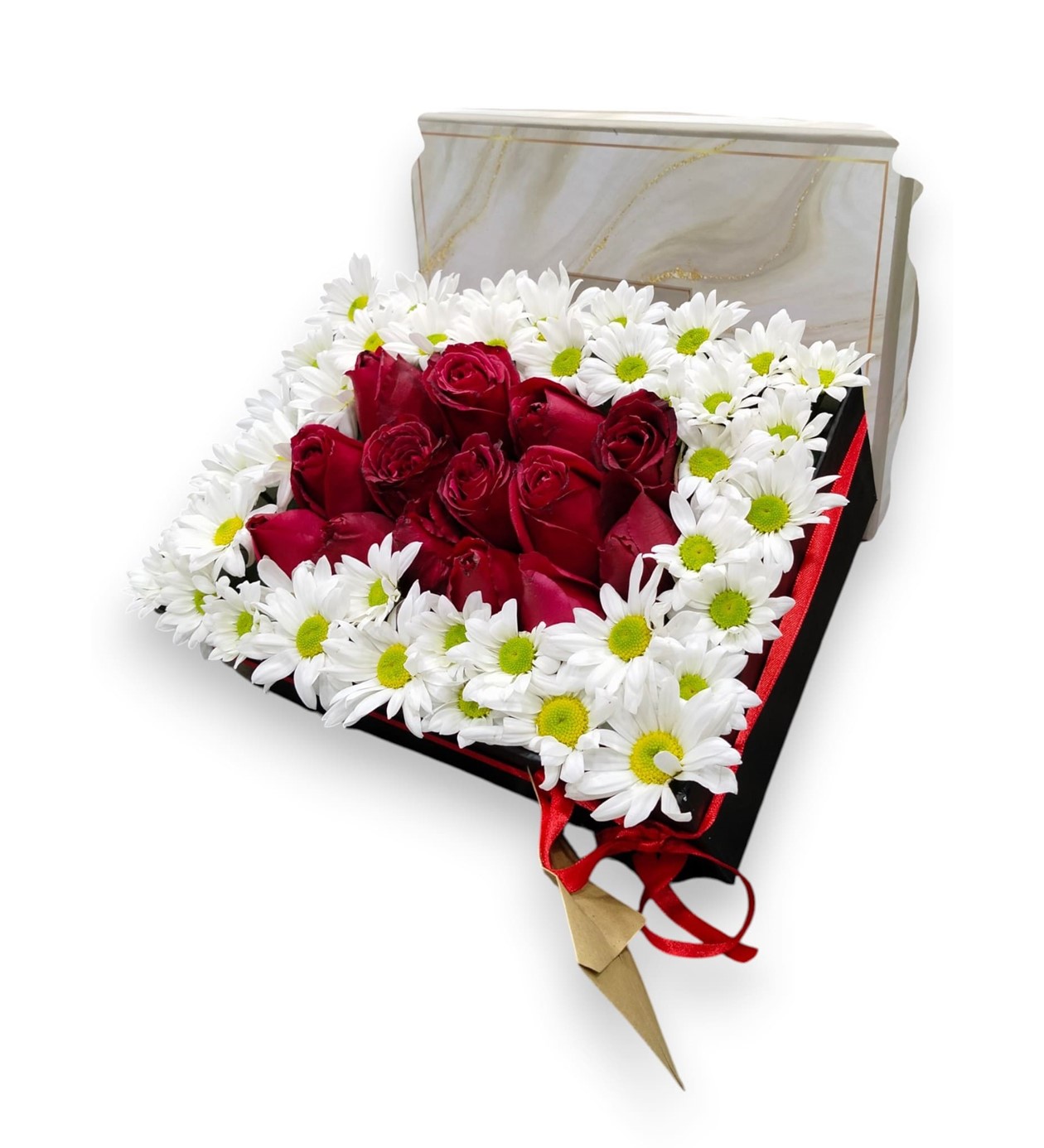 Duygularınızı en saf ve en tutkulu haliyle ifade etmeniz için tasarlanan bu özel kutu, papatyanın masumiyetini kırmızı gülün asaletli duruşuyla birleştiriyor. Modern bir sunumla hazırlanan bu aranjman, sevdiklerinize kendilerini özel hissettirmenin en şık yoludur.