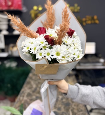 Masumiyetin simgesi beyaz papatyalar ile aşkın sembolü kırmızı gülleri, modern ve doğal bir sunumla bir araya getirdik. Bu özel el buketi, hem sade hem de etkileyici bir hediye arayanlar için floristlerimiz tarafından özenle hazırlandı.